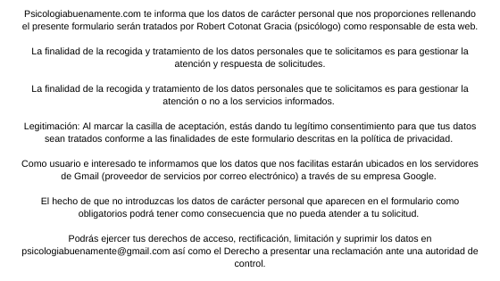 Contacto Pregunta lo que quieras ← VolverSe ha enviado tu mensaje Nombre(obligatorio) Advertencia Correo electrónico(obligatorio) Advertencia Teléfono Advertencia Mensaje Advertencia (obligatorio) He leído y acepto la política de privacidad Advertencia Este formulario recoge su nombre, correo electrónico y número de teléfono para que podamos contactar con usted. Consulte nuestra política de privacidad para ver cómo protegemos y gestionamos los datos enviados. Doy mi consentimiento para que Psicologia Buenamente recoja mi nombre y mi correo electrónico. (obligatorio) ¡Aviso! EnviarEnviando formulario Δ Información adicional. Política de privacidad Compártelo: Compartir en WhatsApp (Se abre en una ventana nueva) WhatsApp Comparte en Facebook (Se abre en una ventana nueva) Facebook Share on LinkedIn (Se abre en una ventana nueva) LinkedIn Email a link to a friend (Se abre en una ventana nueva) Correo electrónico Imprimir (Se abre en una ventana nueva) Imprimir Me gusta Cargando...